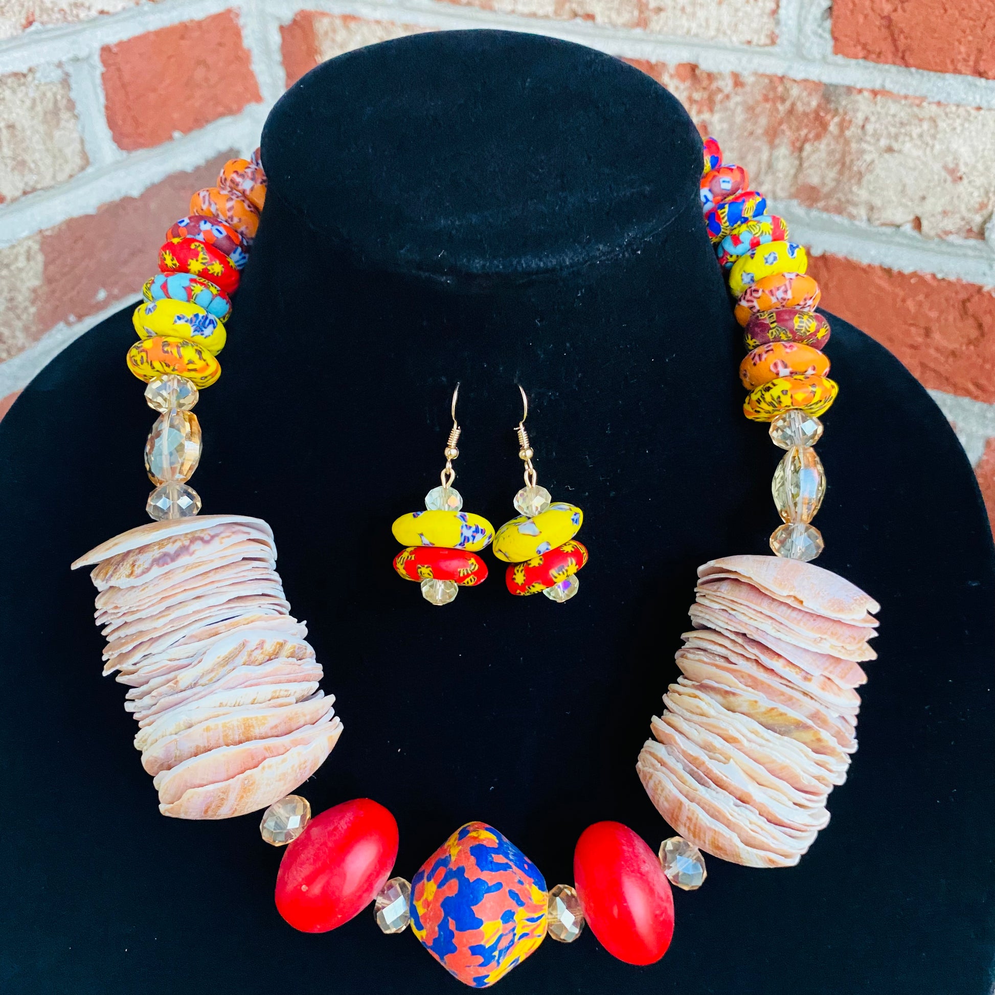 A truly unique blend of real sea shells, hand-painted African glass and crystal beads, with a tie-dyed stone focal point, flanked with complimentary oversized beads. Where on earth would you find this uniqueness?!