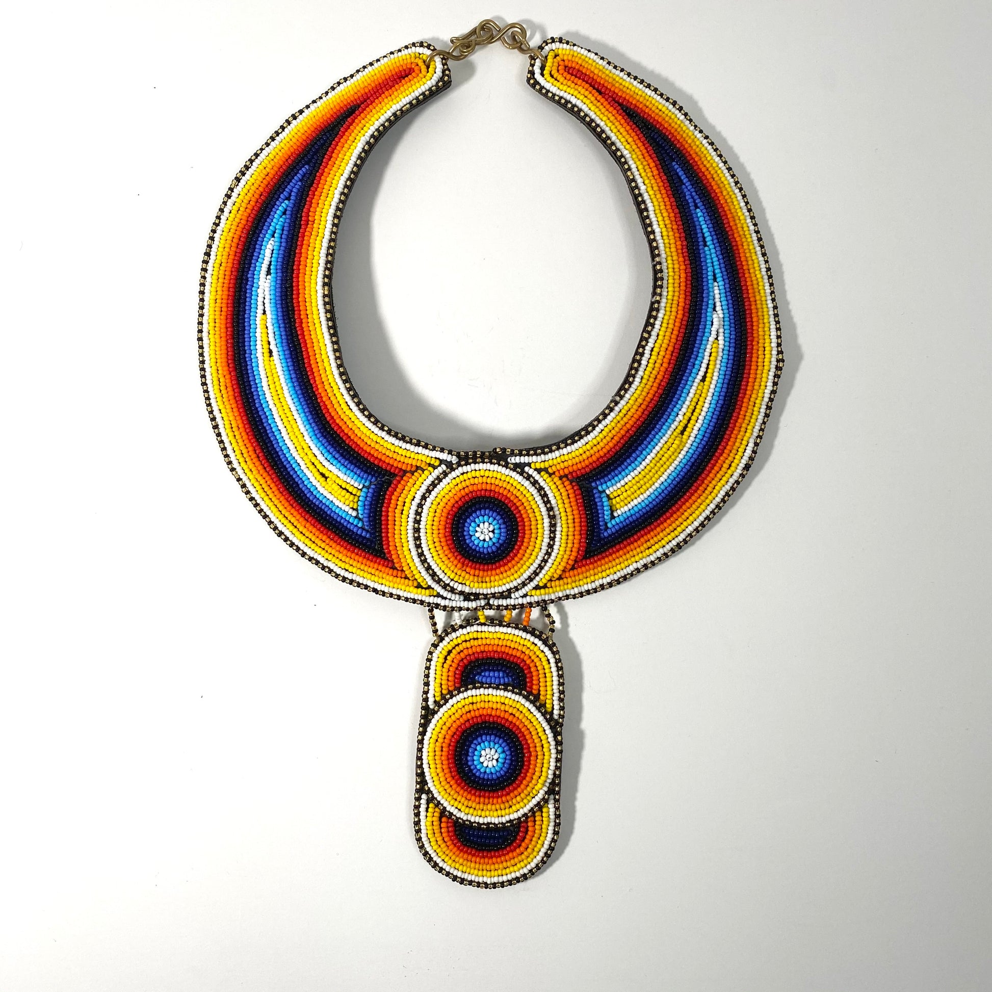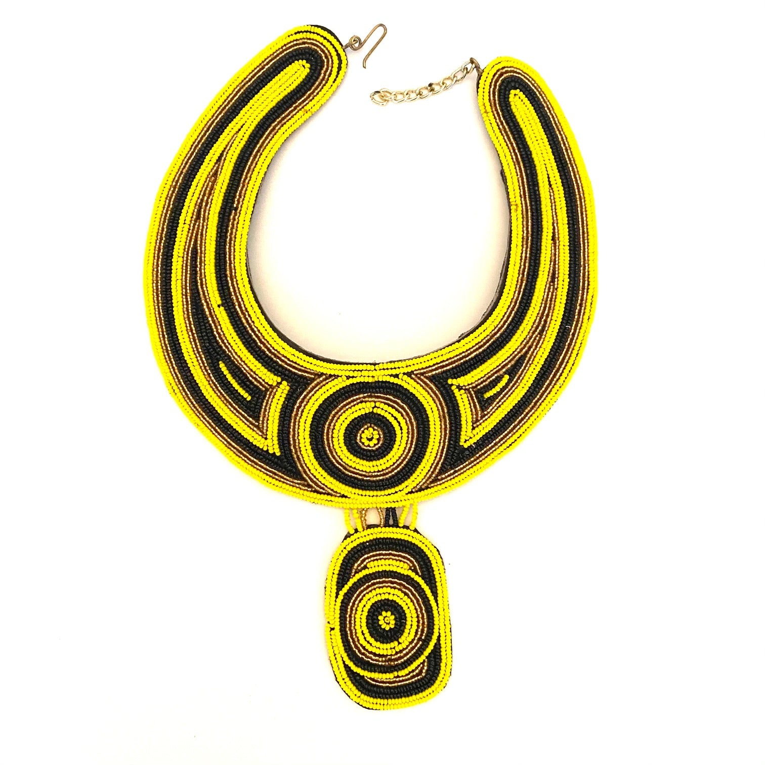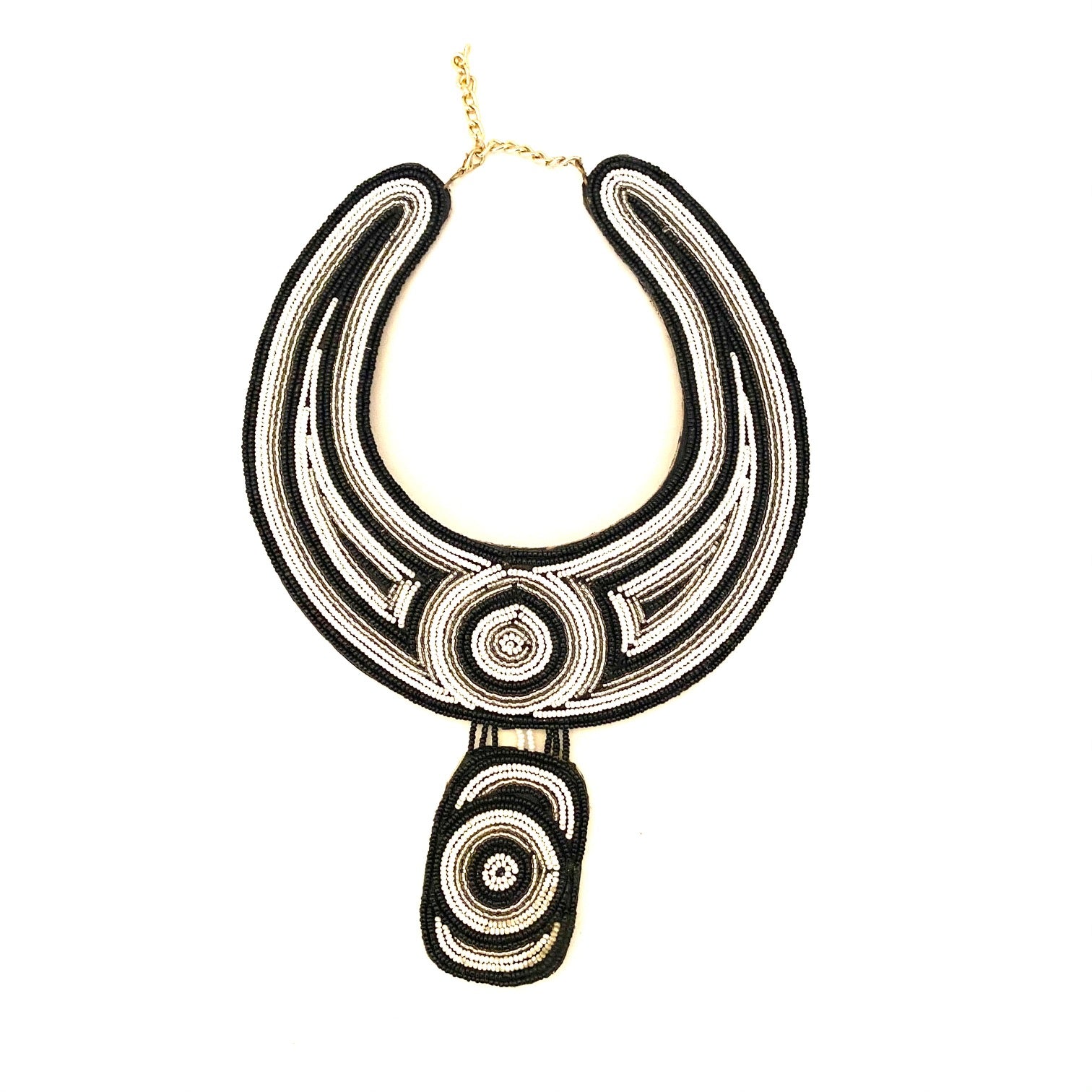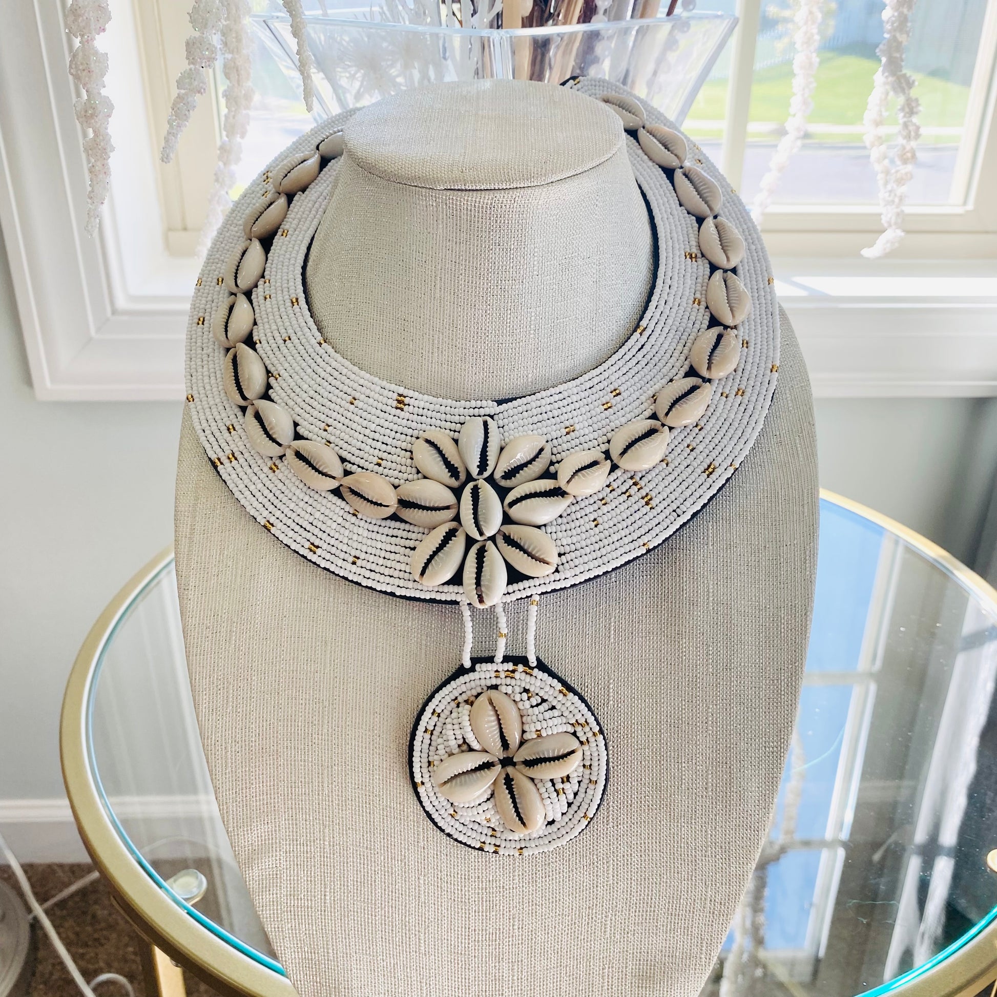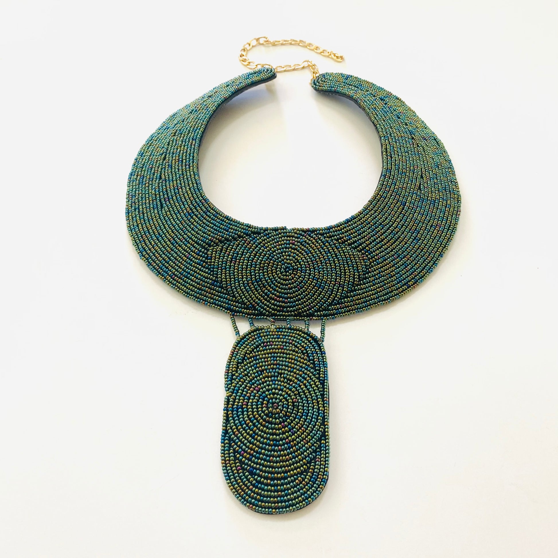 High-grade, African beads intricately woven together to create these masterpieces. Adjustable chain closure with a velvet backing/lining.